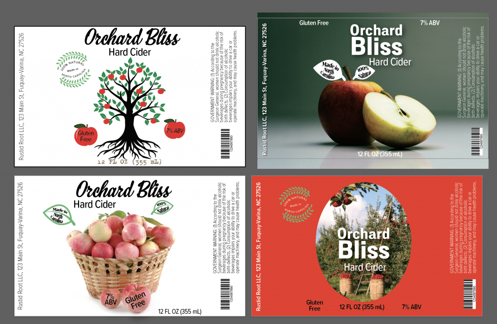 Orchard Bliss, a new entrant in the rapidly growing hard cider market, confronts significant challenges as it seeks to establish a competitive presence in a landscape dominated by established brands. The company must navigate a complex market environment that requires strategic decision-making across multiple dimensions. At its core, Orchard Bliss must develop a compelling strategy for market differentiation, recognizing that the hard cider sector has experienced explosive growth since 2012, with major players like Angry Orchard capturing substantial market share. I was commissioned to develop the visual branding for Rustic Root’s inaugural hard cider, Orchard Bliss, creating a distinctive logo and label design that captures the brand’s essence of local, artisanal apple production.